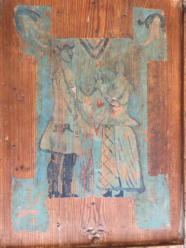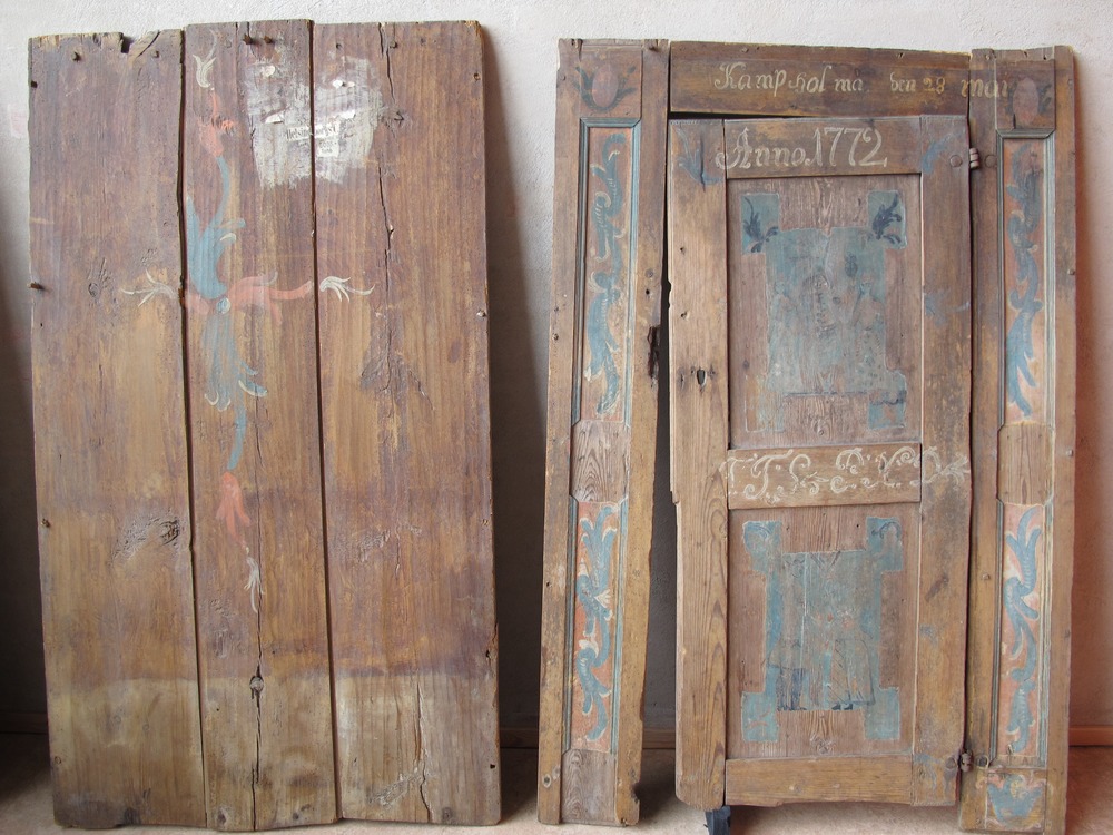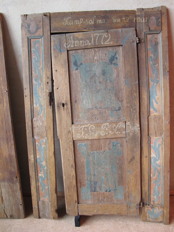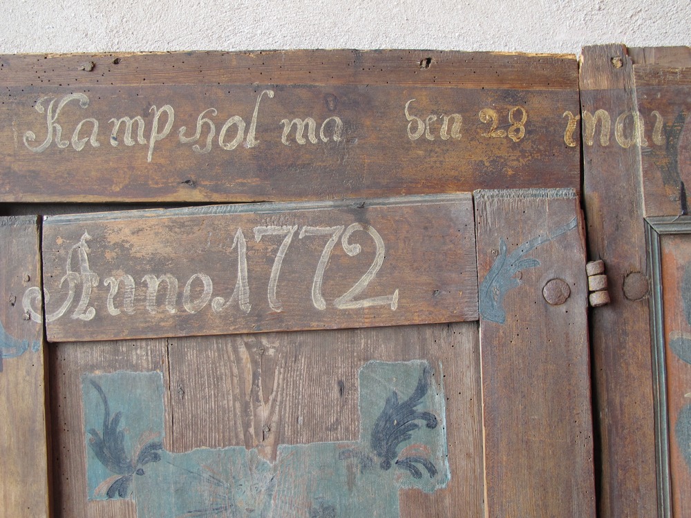 På framsidan av skåpet finns en skåpslucka indelat i två speglar. På båda sidorna om skåpsluckan ses utpasseringar med bladornamentik, och ovan för skåpsluckan är en text målat ”Kamp hol ma den 28 mai”. På skåpsluckan övre kant finns texten ”Anno 1772” och på brädan mellan de två speglar är två initialer målat troligen ” T.T.S P.H.D” .Målningen i den övre spegeln föreställer en person med strålglans som verkar hålla något som kunna likna ett riksäpple, på var sida om denna står två personer. På den nedre målningen ses en man och en kvinna hållanda varandras händer.