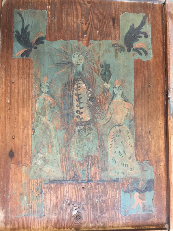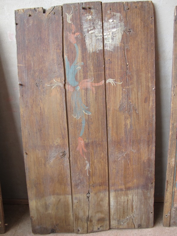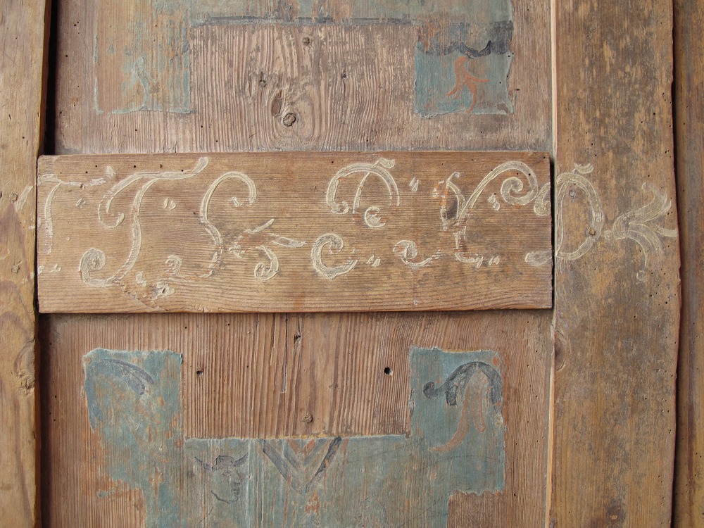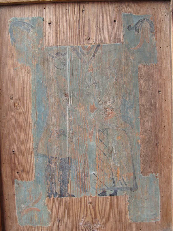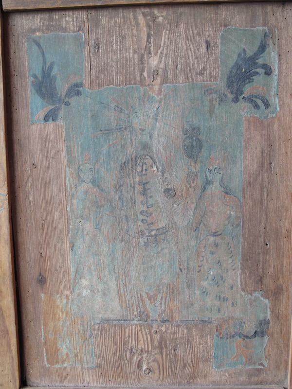 Även baksidan av skåpet har blivit utsmyckat med ornamentik på brun baggrund. Slittagen av bemålningen på skåpet baksida indikera att en bänk eller annat sittmöbel möjligen har stått upp av skåpets baksida.