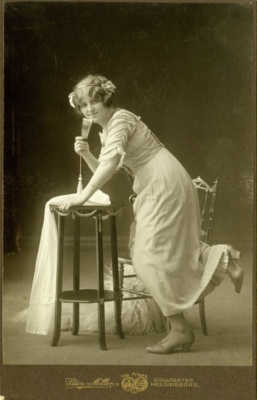 Porträttbild av Edith Klintman stående med ett knä lutat mot en stolsits. Hon är iklädd lång klänning med armbågslång ärm med volang. Håret är uppsatt och på huvudet sitter ett diadem med rosetter. I ena handen håller hon en solfjäder med tofs, andra handen vilar på ett bord. Kroppen är i profil, ansiktet vänt mot fotografen. På bordet ligger ett ljust tygstycke och på golvet vad som ser ut att vara en ljus päls. Fotografiet är monterat på en mörk pappskiva med på framsidan ateljénamnet präglat i guld: " Steen=Möller (symbol) KULLAGATAN / HELSINGBORG". På baksidan "omkr. 1912" samt "9029" skrivet med blyerts. På baksidan finns även Steen-Möllers företagstryck.