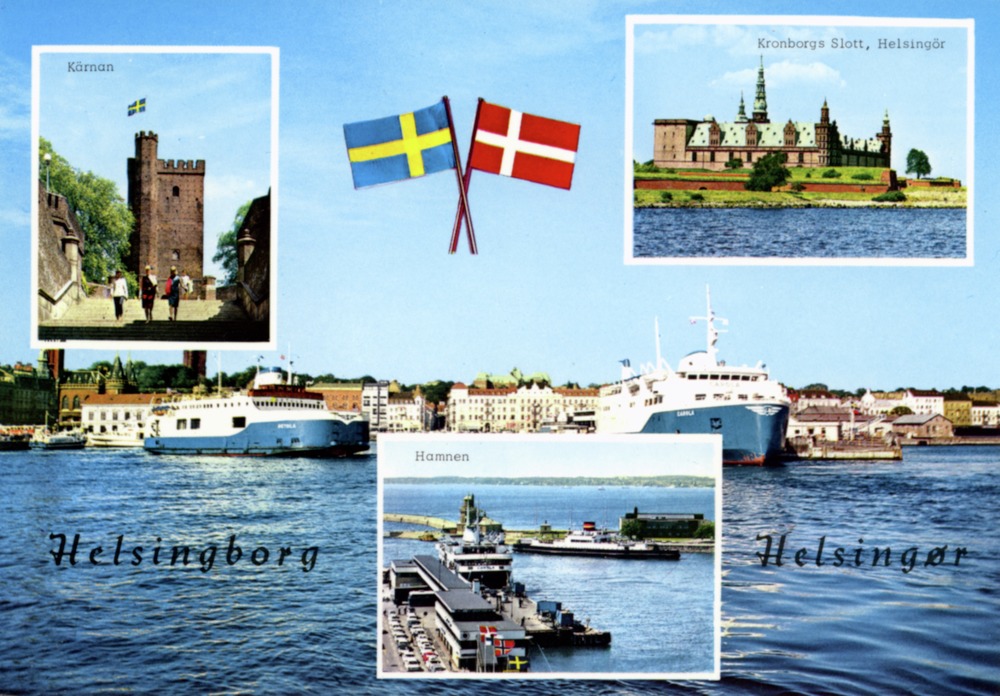 - Vykort med montage av fyra stycken färgfotografier. Ett foto över Helsingborgs hamn, mot land och med fartygen M/S Betula och M/S Carola i förgrunden, utgör bakgrund. Ovanpå det tre stycken bilder med motiv från Helsingborg och Helsingör: Kärnan, Hamnen och Kronborgs Slott. På bakgrundsbilden pålagt två stycken korslagda flaggor, en dansk och en svensk, samt text i svart: Helsingborg Helsingør. Vykortet har vågformig kant. Tryckt text på baksidan: "Ultraförlaget A. B. - 113 30 Stockholm" och "Sk 677 Foto: T. Lindeberg".