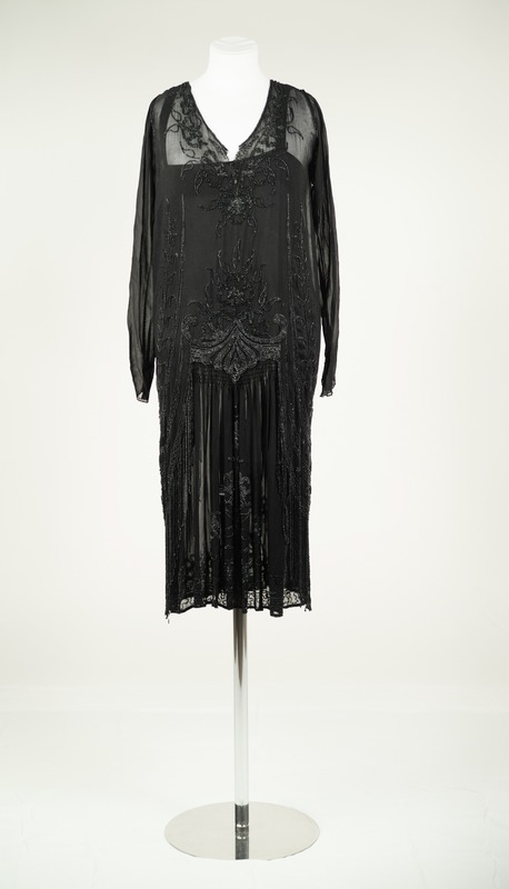 - V-ringad, knälång, långärmad klänning i genomskinlig svart tyll, med fastsydd svart underklänning med smala axelband. Ytterklänningen är rikligt pärlbroderad med små svarta glaspärlor. Från midjan och nedåt utgör pärlorna långa fransar som hänger löst runt kjolen. Ärmarna knäpps runt handleden med liten tryckknapp.