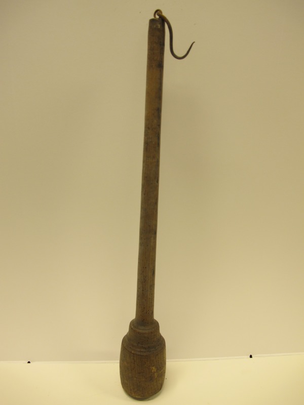 Besman av trä, bestående av en stång med krok av järn i ena änden och en avlång motvikt med platt botten i den andra. Handtag saknas.