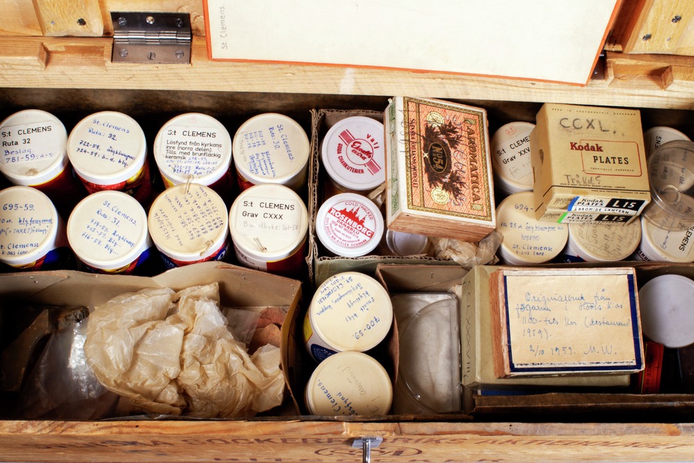 - En upprustad "Svenska Sockerfabriks Aktiebolaget"-låda som har försetts med handtag, gångjärn med mera för att användas vid en arkeologisk utgrävning av Sankt Clemens kyrka, genomförd av Margareta Weidhagen.