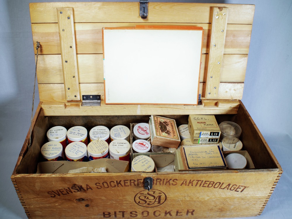 - En upprustad "Svenska Sockerfabriks Aktiebolaget"-låda som har försetts med handtag, gångjärn med mera för att användas vid en arkeologisk utgrävning av Sankt Clemens kyrka, genomförd av Margareta Weidhagen.