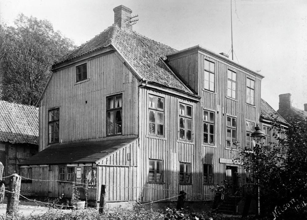 Bilden föreställer fd Tornerhjelmska huset 1901. I förgrunden staket och lite växtlighet. I bakgrunden ett tvåvåningshus med uthus på sidan och bakom. PÅ framsidan en trappa.