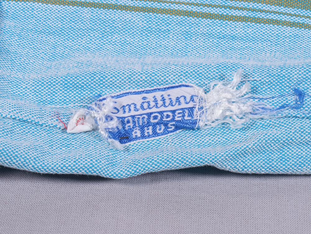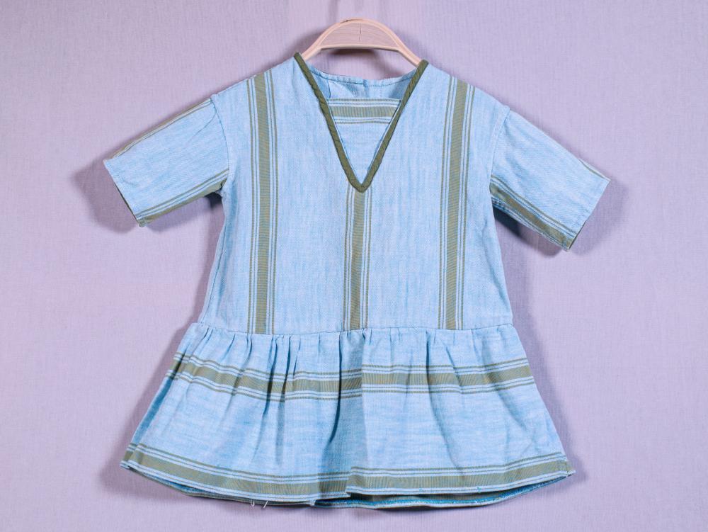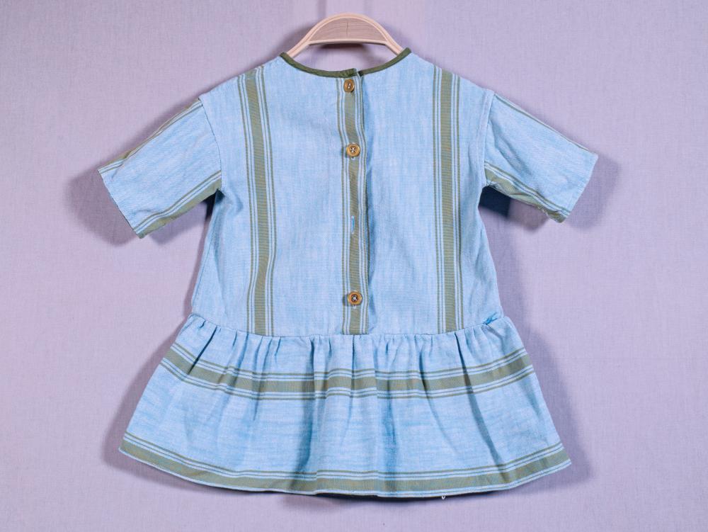 - Kortärmad klänning i randigt bomullstyg. Tyget är ljusblått med ljusbruna ränder, långt mellanrum emellan. Något längre liv med ränderna lodrätta. Kort, draperad kjol med ränderna vågrätta. Halsen markerad med mossgrön tygkant i spetsig v-ringning. Klänningen knäpps baktill med fyra mässingknappar i livets rygg. Den tredje knappen ovanifrån fattas.