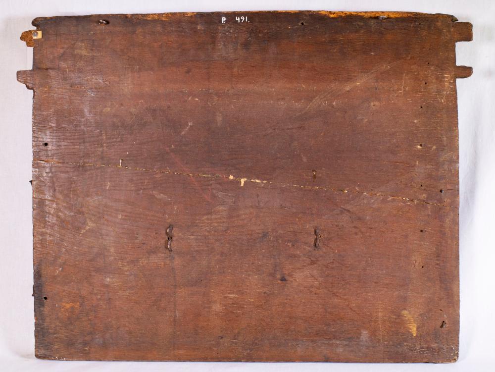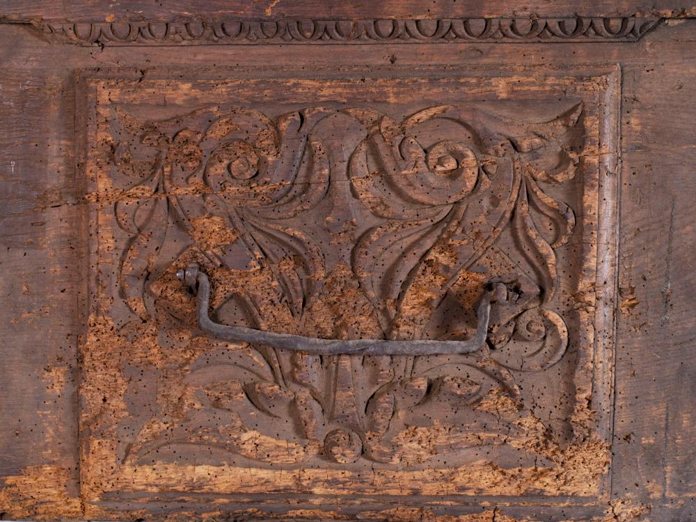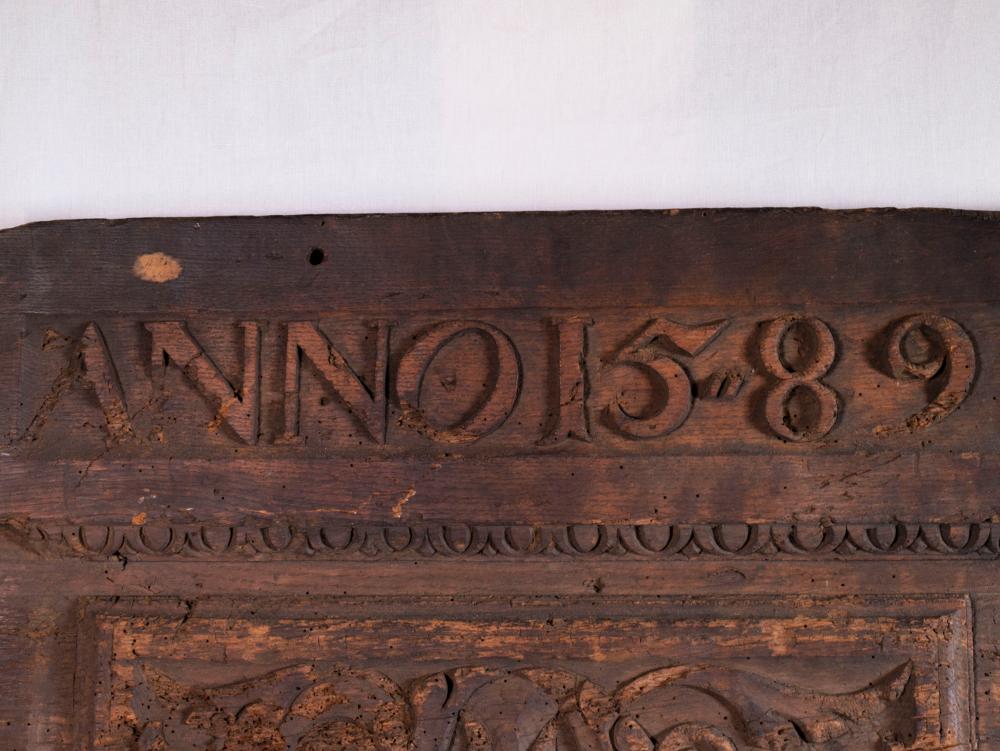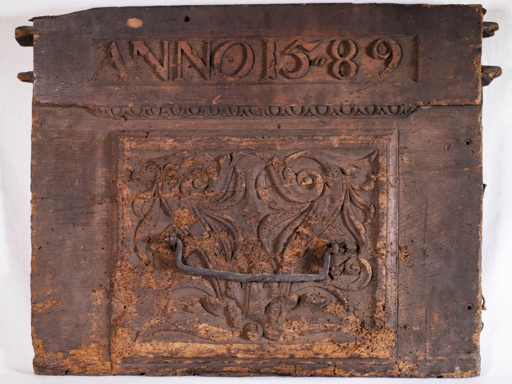 Kistgavel i ek. Kvadratisk form med rester av sinkor upptill på sidorna. Snidad upphöjd mitt med växtmotiv. Överst upphöjt och inskuret "ANNO 1589". Utskuren blomlist nertill. Smidat järnhandtag som sitter fast i två järnöglor. Två metallöglor för upphängning baktill.