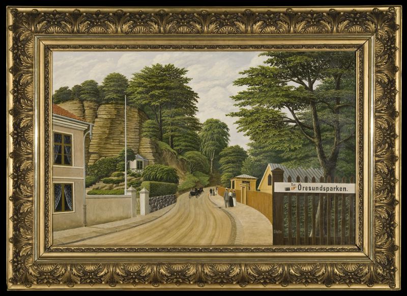 - Vy över Hälsovägen, Helsingborg, österut. Till höger skymtar Öresundsparken och Sofia källan, till vänster en byggnad med dess trädgård, flaggstång och lusthus. Oljemålning på papp inom brun ornamenterad (kredering) bronserad träram (akantusblad).