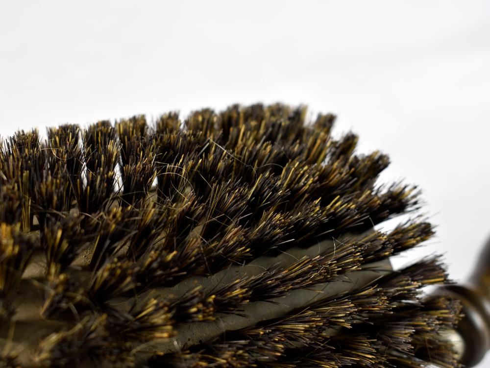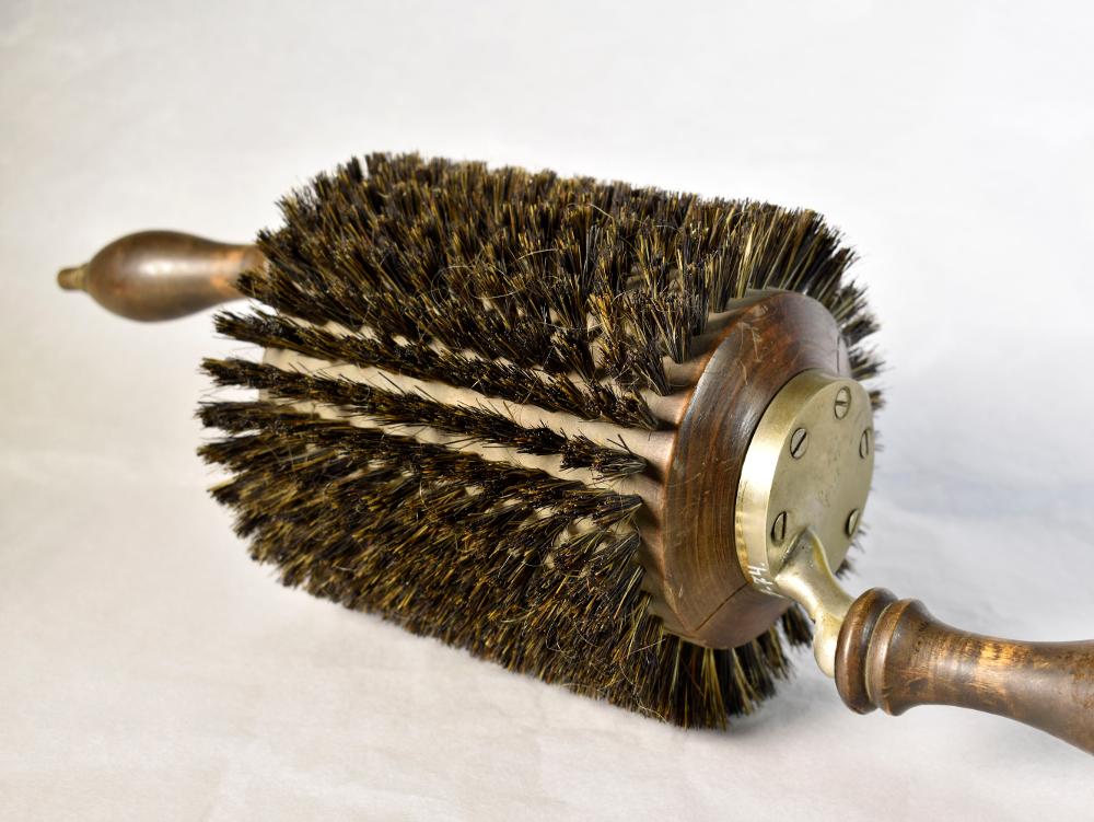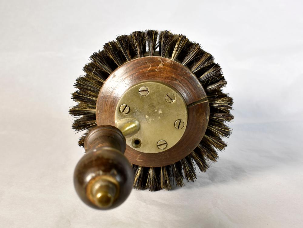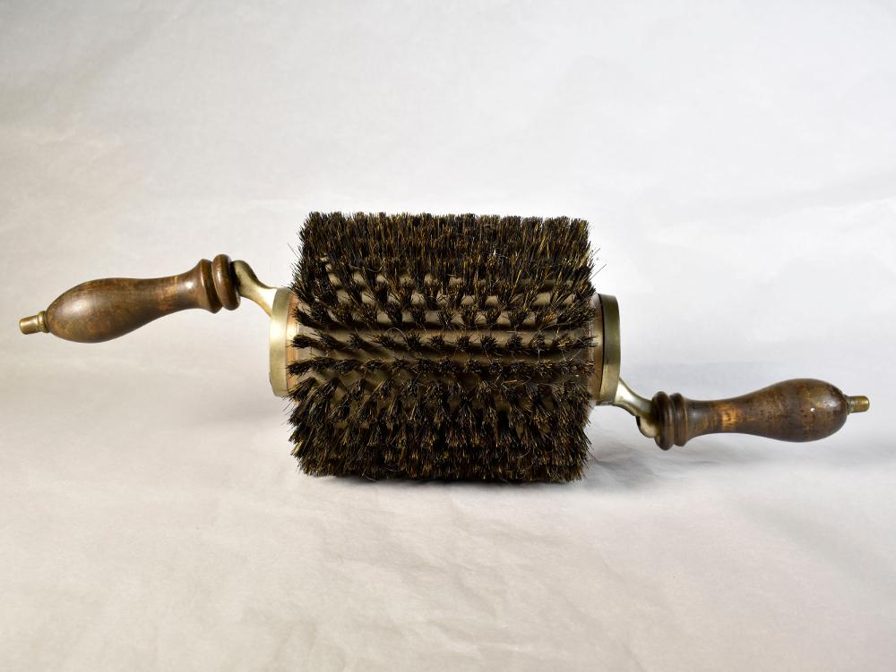 - Cylinderformad perukborste med trästomme och borst av tagel. Ett svarvat trähandtag i vardera ände, assymetriskt placerade för att kunna skapa rotation. Handtagen fästa i runda järnplattor med sex skruvar på vardera sida. En skruv fattas på en sida.