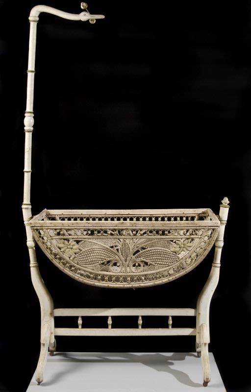 Vagga i vitmålat trä med förgyllningar och flätad korg med ställning för sängomhänge. Rektangulär form på korgen med från kortsidorna rundad botten. Något inåtvinklade långsidor. Korgen har flätade blad och blommor. Långsidorna är kantade med rundlar som hålls ihop av förgyllda kulor. Mitt på kortsidorna sitter korgen fast i svarvade ståndare som har förgyllningar och nertill böjer inåt och blir rektangulära med rundade kanter. Från dessa strålar två bakåt och framåt vinklade, svängda ben med profilerad överkant. Benen har metallhjul. Ståndaren vid fotändan avslutas med en svarvad knopp medan den vid fotändan fortsätter uppåt och övergår i ett fågelhuvud som svänger in mot korgen. Fågeln håller en metallpinne i munnen med förgyllda knoppar i ändarna. Pinnen ska användas för fastsättning av sängomhänge.