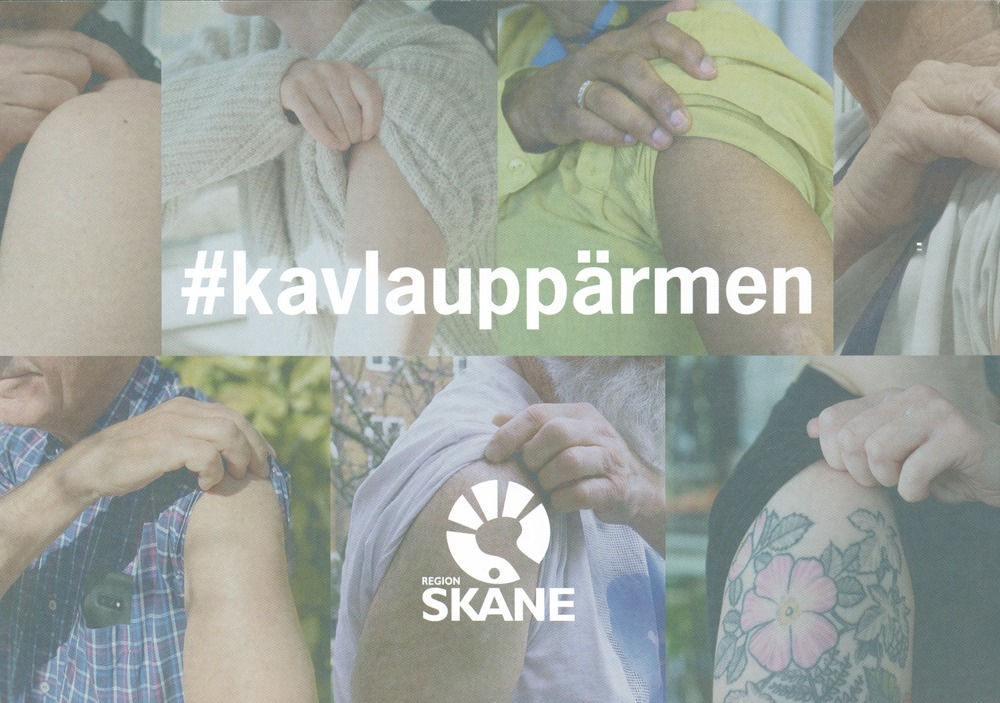 Vykort med information omhur man bokar tid för vaccination mot Covid-19. På framsidan finns flera bilder på överarmar och uppkavlade kläder. Över bilderna står texten: #kavlauppärmen samt Region Skånes logotype. Vykortet är postat till Birgitta Witting.