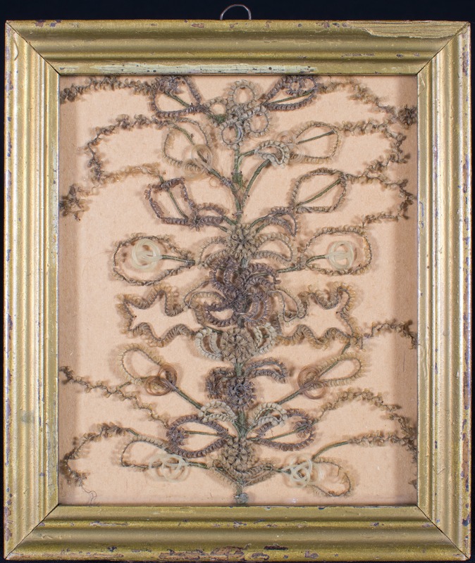 Hårsmycke, tavla av ljust, ljus- och mörkblont hår bildande en enorm blombuske, tavelramen förgylld.