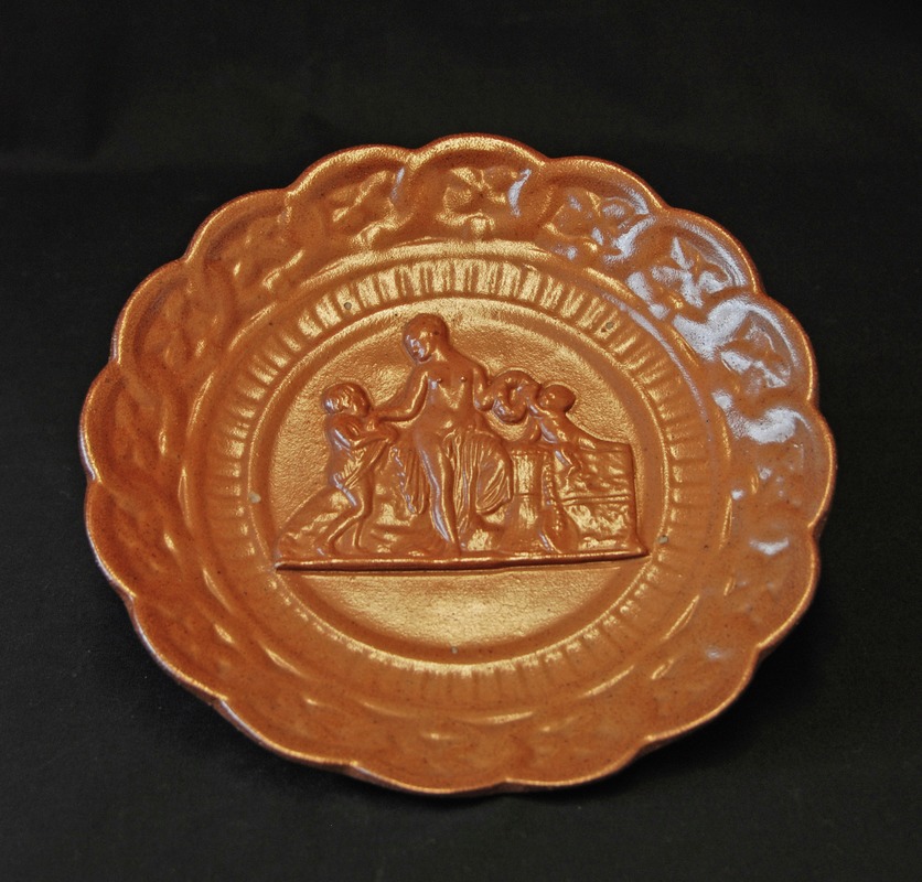 Fat av saltglaserat stengods med figurscen som en allergori av Våren. På baksidan finns arrangemang för att kunna hänga fatet på väggen. Stämplat HÖGANÄS, H-ankare-B, KP.