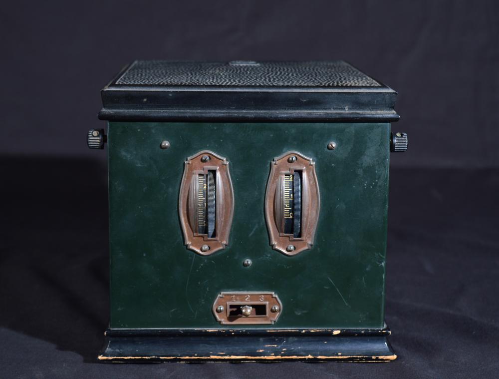 - a:Radio av plåt, grön och svartlakerad, bottenplatta av trä, lock av bakelit, knappar för fininstälning, utag för separat högtalare. b:tratten av papp med stickad bård lös startnyckel av mässing