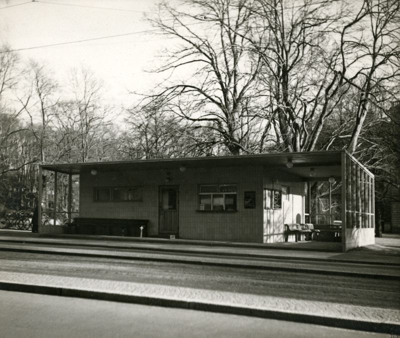 Fotografi av vänthall för Hälsingborgs stads spårvägar vid Trädgårdsgatan, dåvarande Knutpunkten i Helsingborg. Husets fasad är klädd med kIinker. Fotografiet är märkt RS som troligtvis betyder Ragnar Siebke.