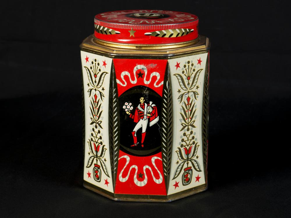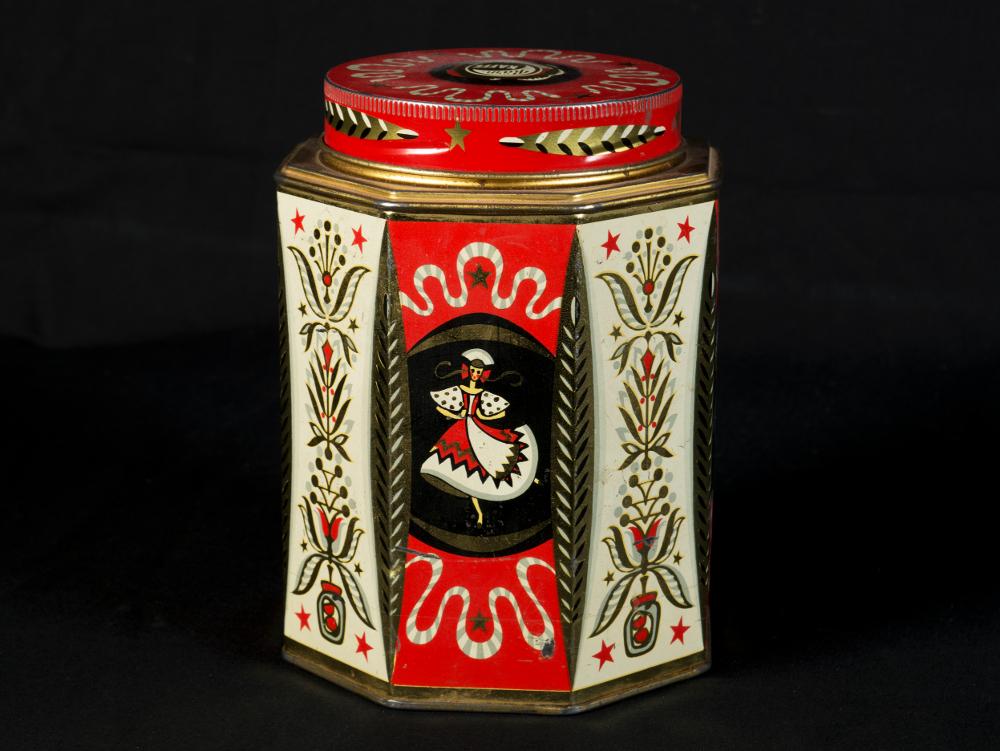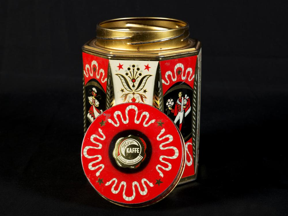 Åttkantig burk med runt skruvlock. Huvudsakligen röd, vit och svart med stiliserade figurer i folklig dräkt samt slingor. På locket sigill-liknande emblem med text "Kärn-KAFFE, kaffet med arom".