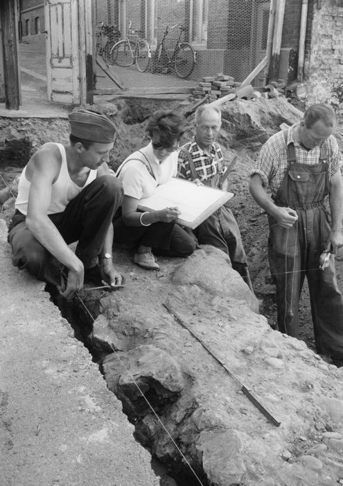 - Fotografi på utgrävningsarbete, Sankt Clemensgata av S:t Clemens kyrka. Arbetsbild med kärngänget vid 1958-62 års utgrävning i färd med att mäta upp S:t Clemenskyrkans norra långhusgrund ute i gatan. Från vänster ses Sven Thulin, Margareta Esbjörnsson-Weidhagen, Knut Svensson och Lasse Pettersson.