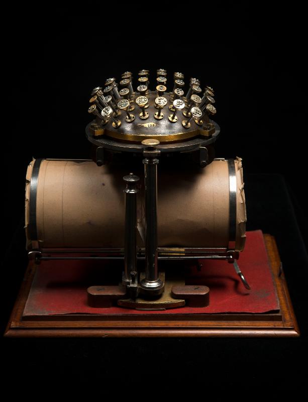 Skrivmaskinens tangentsats med blindskriftstecken som på papper konverteras till latinska bokstäver. Tangentsatsen i form av en halvsfär, med nedslagsstift samlade centrum.
