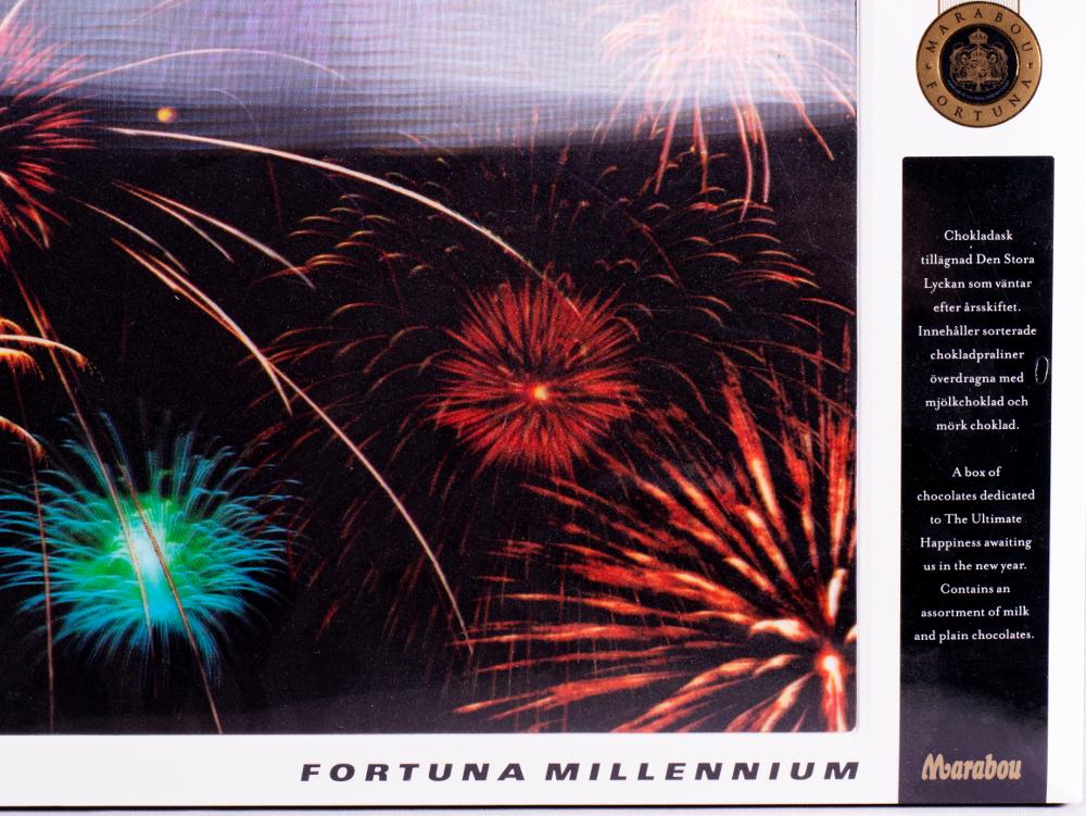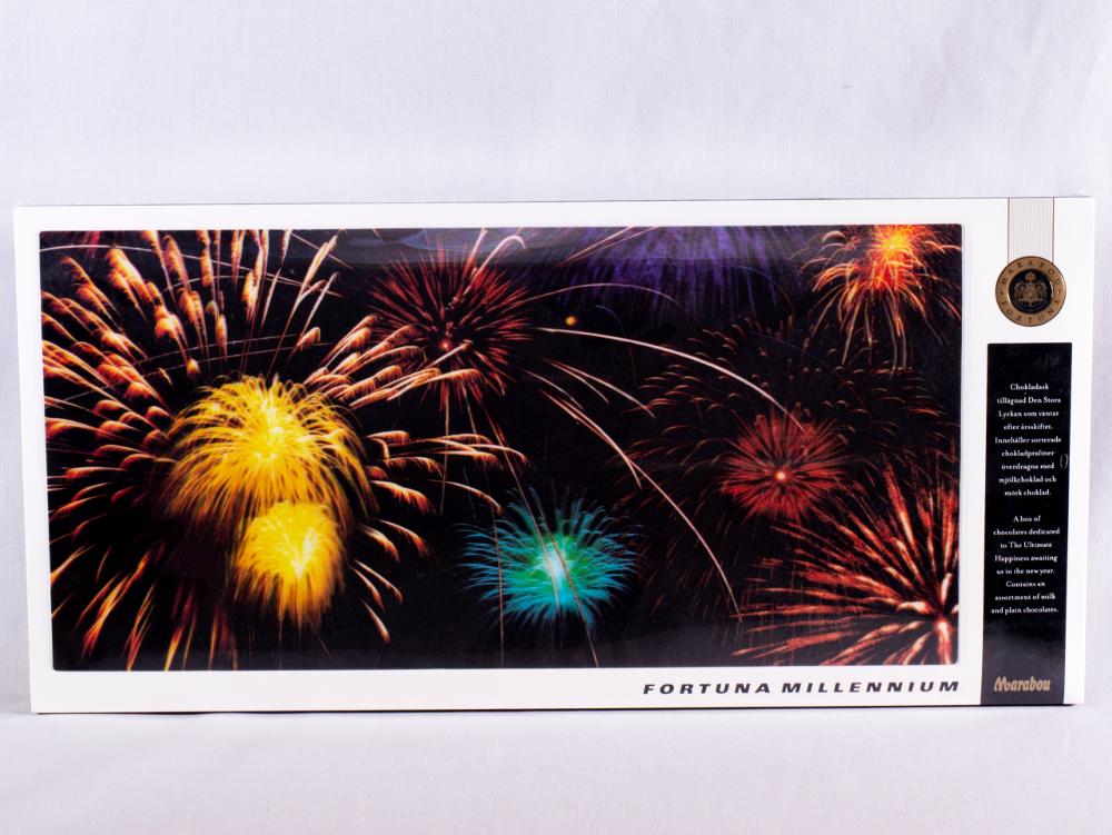 Provchokladask med hollogrambild av fyrverkerier på ovansidan. Text ovansidan: "FORTUNA MILLENNIUM, MARABOU, Chokladask tillägnad Den Stora Lyckan som väntar efter årskiftet. Innehåller sorterade chokladpraliner överdragna med mjölkchoklad och mörk choklad."