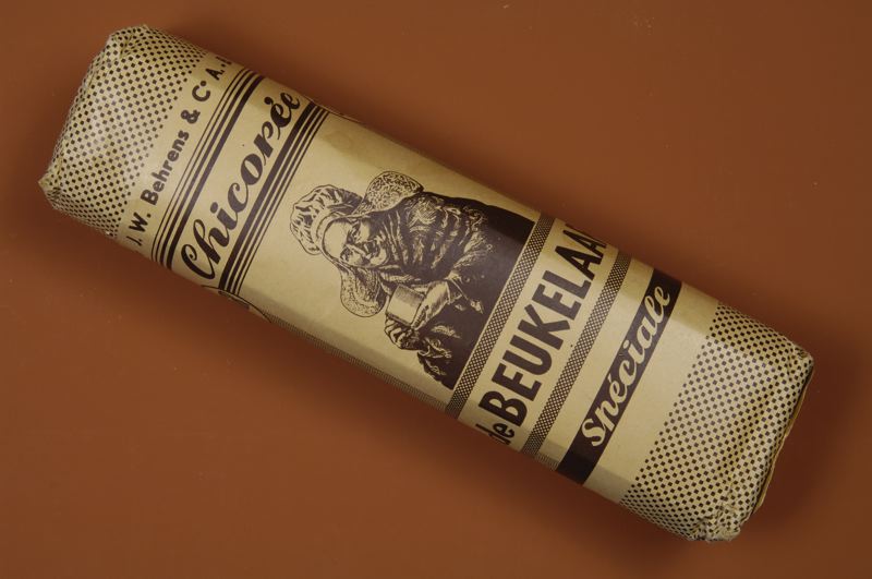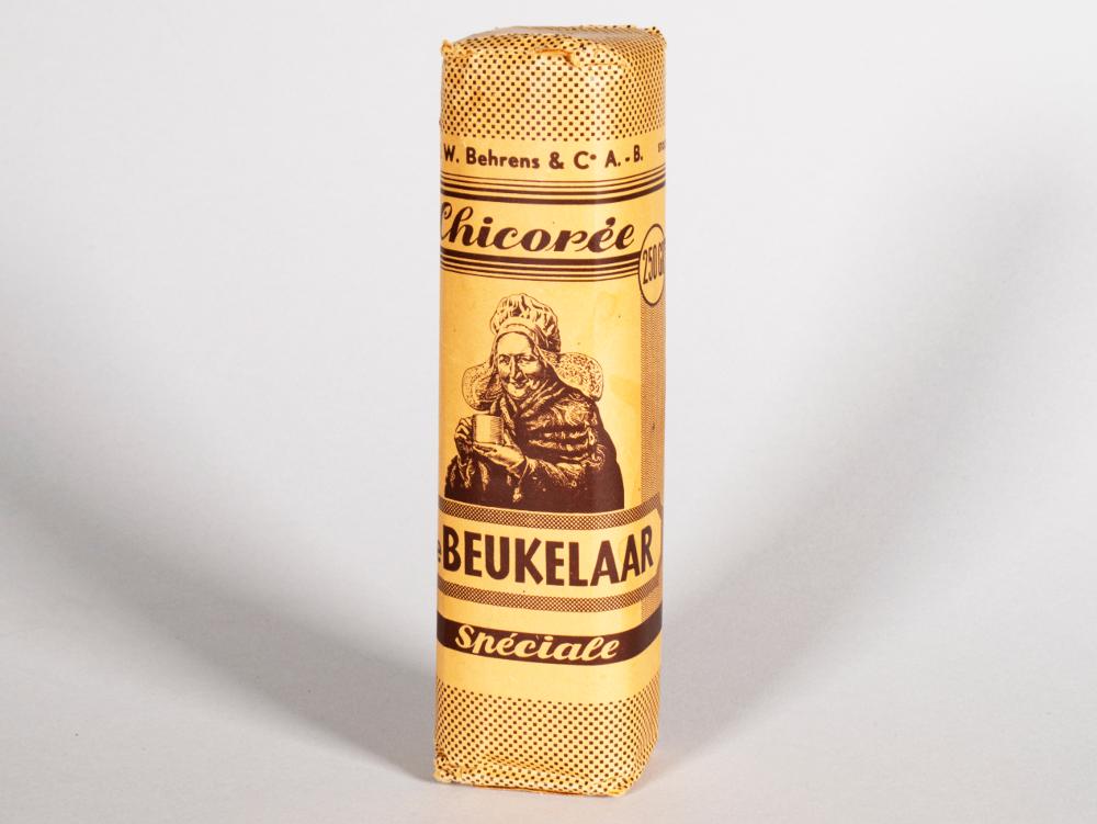 Surrogatkaffe tillverkat av rötterna från cikoriasallad. Förpackat i beige pappersomslag med brunt tryck. I mitten en bondmora med kaffekopp i handen. Dekor med geometriska mönster. På ena kortsidan gul etikett med röd text: spéciale". Märke: "Chicorée" från "de Beukelaar".