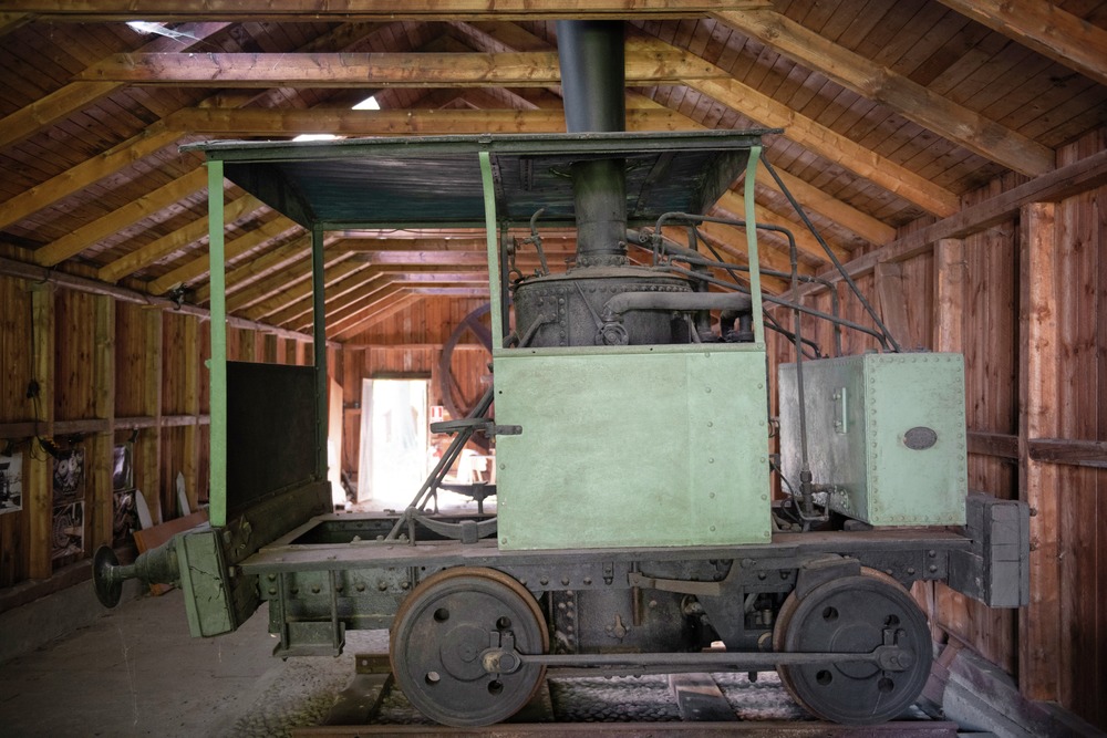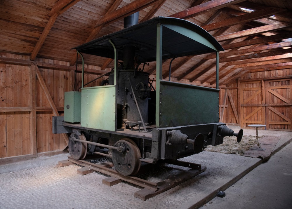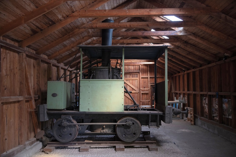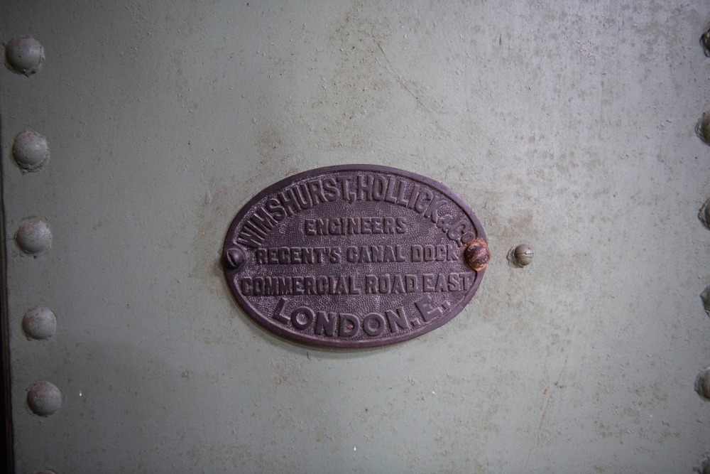 Växellokomotiv med stående ångpanna. Grönmålade sidor av järn. På vardera sidan längst bak finns en oval skylt med återförsäljarens namn: Wimshurst, Hollick & Co. Där man stiger ombord finns en träpall monterad vid sidan. Trätak med blå insida som hålls samman med svarta järnband.