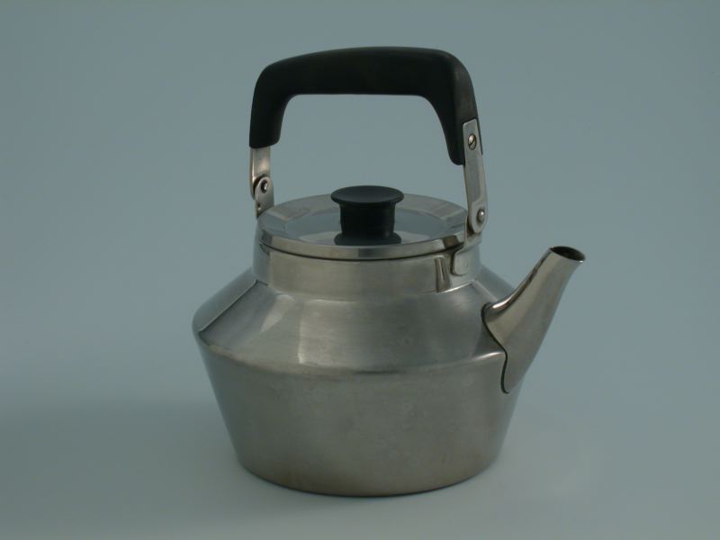 Vattenkittel av rostfritt stål och bakelit, handtag och knopp på lock av sistnämnda material. Modellen designad av Sigvard Bernadotte.